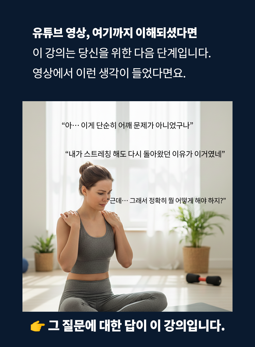일시적으로 통증을 완화해주는 어깨 스트레칭이 아니라 근본적인 원인부터 잡아줘서 내 몸을 이해하면서 들으니까 더 집중해서 수행할 수 있었습니다.